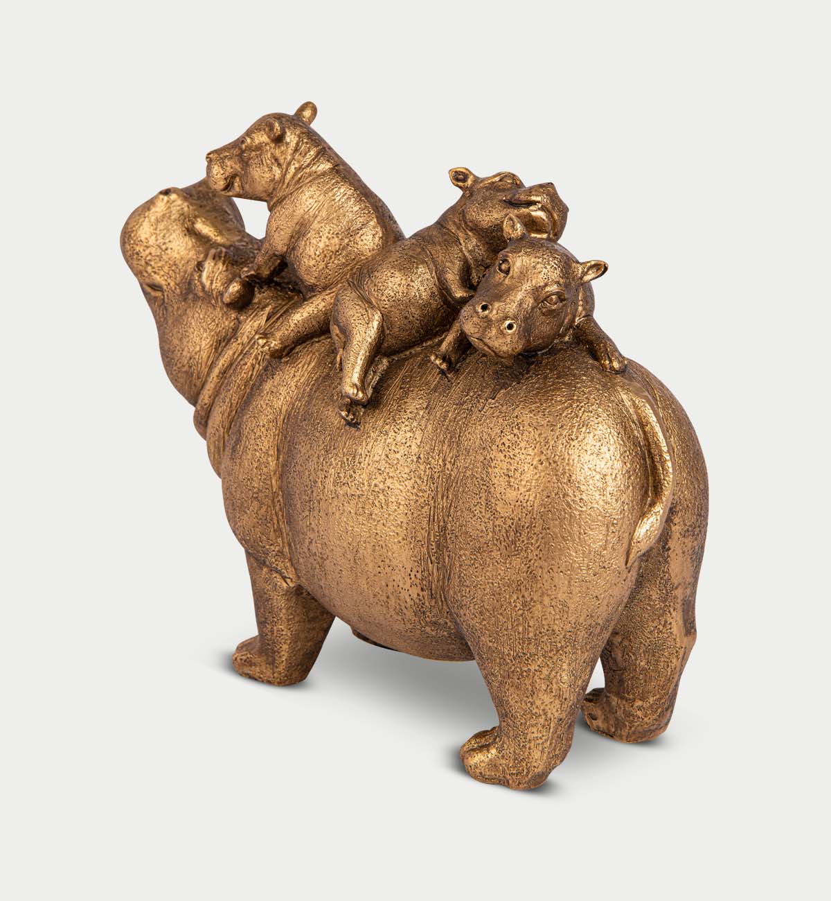 Objekti dekorativ në pamjen e një familje të Hipopotamëve, përmes pamjes së tij të guximshme, prezanton një stil unik të stilimit të shtëpisë. Kjo skulpturë kaq speciale, dallohet për shkëlqimin e artë dhe detajet e rafinuara.