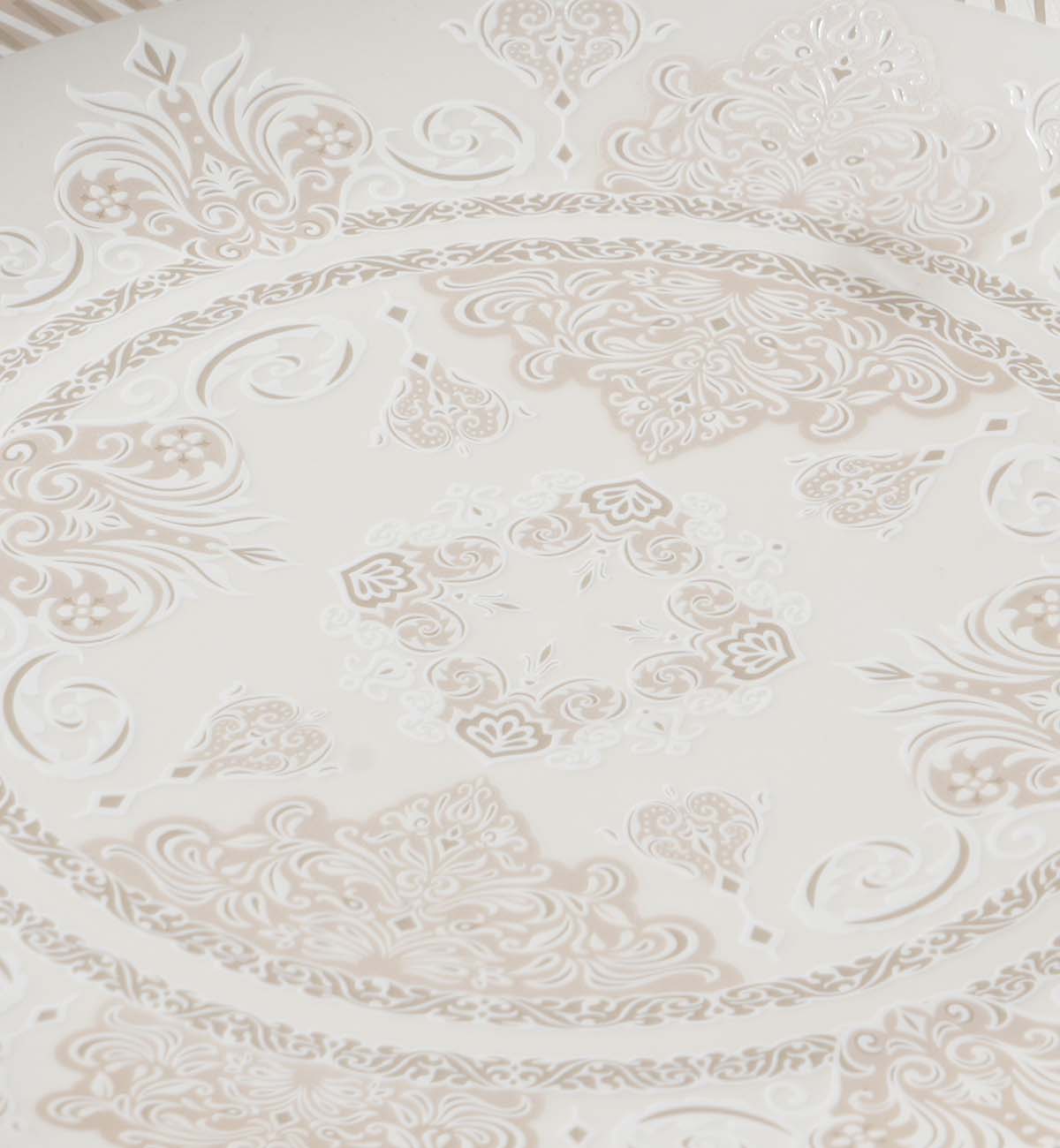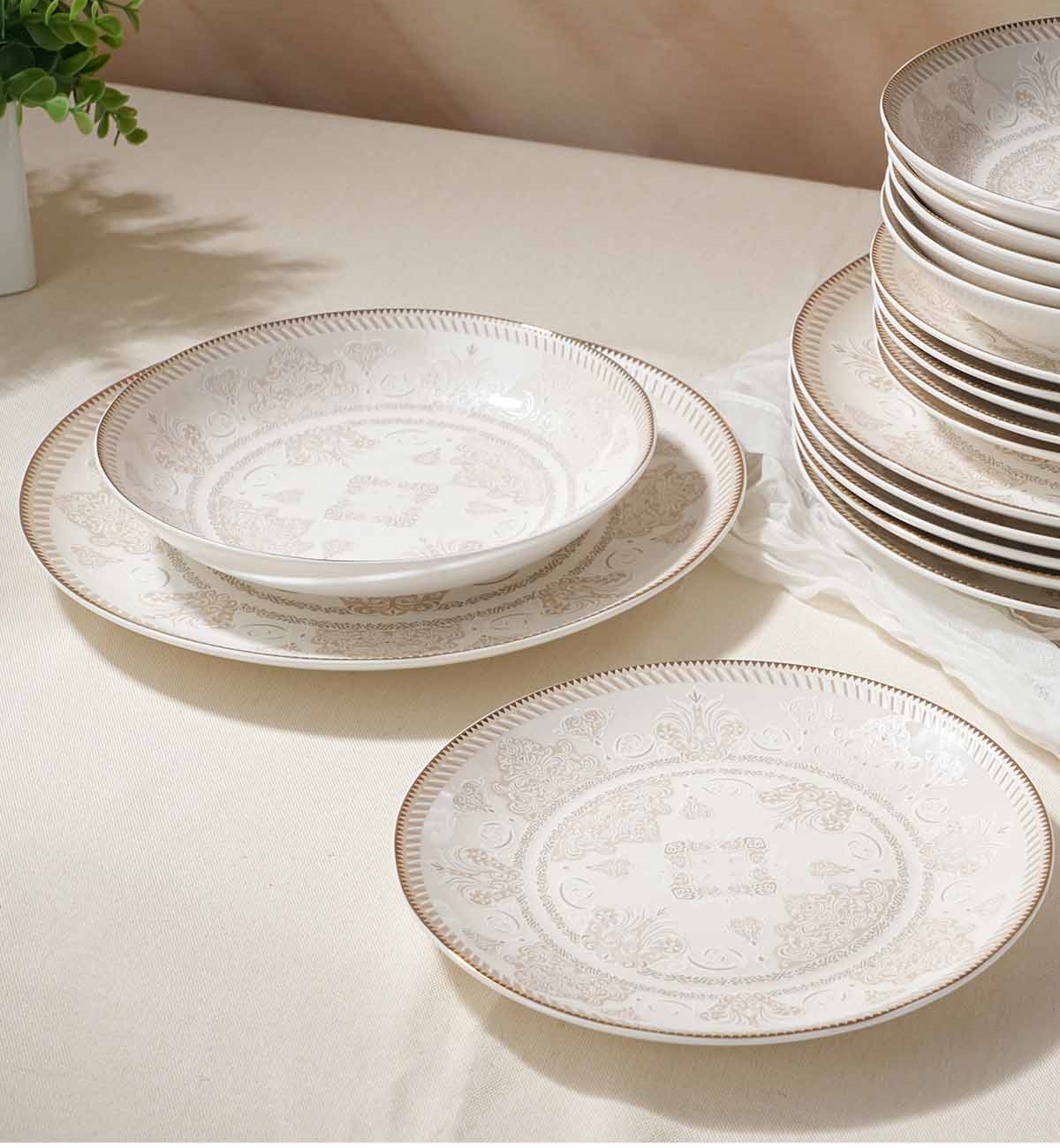 Seti i pjatave Royal Lace elegant është zgjedhja ideale për ata që vlerësojnë stilin klasik dhe finesën në tryezë. Me një dizajn delikat në nuanca të buta bezhë dhe të bardhë, i zbukuruar me motive të rafinuara dhe buzë të arta, ky set sjell një pamje luksoze dhe harmonike në çdo ambient.