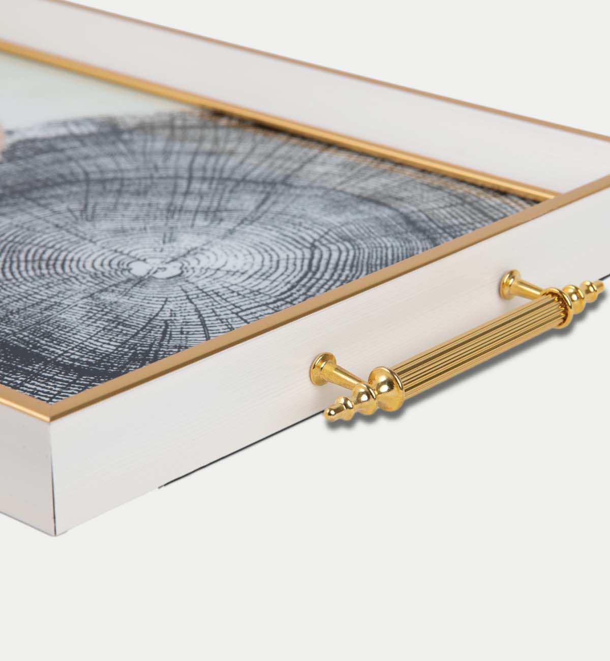 This serving tray features a surface made of plastic and comes with two gold-colored aluminum handles.
