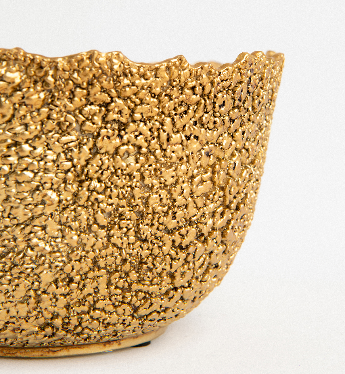 Декоративниот сад од линијата Lump Finished доаѓа со целосна текстура со златен сјај. Со тркалезна форма и рафинирани рабови во неправилна форма, претставува многу посебен изглед. Овој сад помага да се организираат и складираат мали нешта, а во исто време функционира како посебен декор.