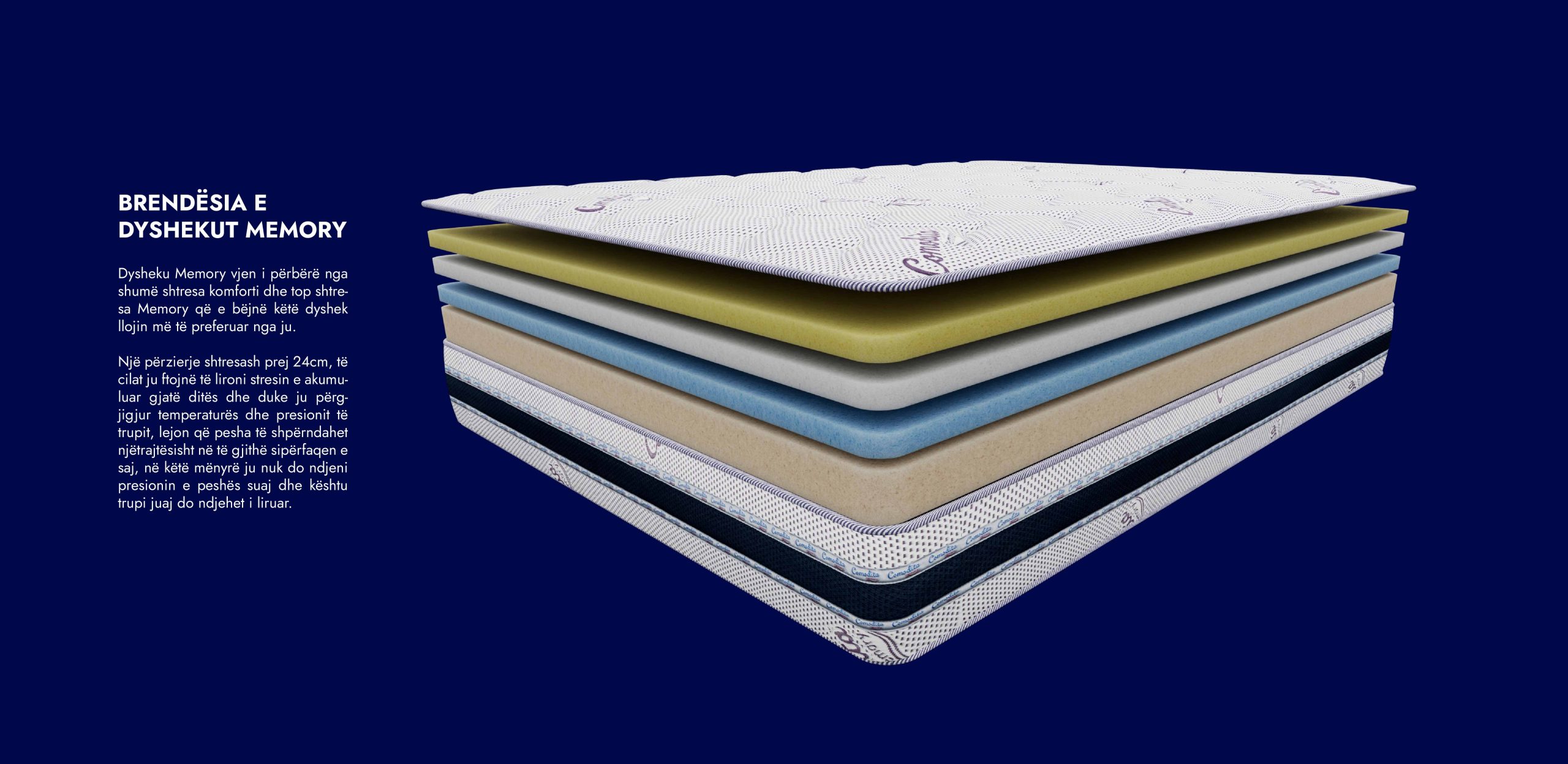 Dysheku Memory është i strukturuar në disa shtresa që finalizojnë një dyshek 26cm të trashë që është jashtëzakonisht i rehatshëm. Struktura e këtij dysheku është dizajnuar nga shtresa e sipërme e Memory Foam, shtresa ndërshtresore e shkumës poliuretani, shtresa bazë e shkumës poliuretani me dendësi më të lartë, anësoret Airmesh për ajrosje optimale dhe mbulesa e dyshekut me mikrofibër.