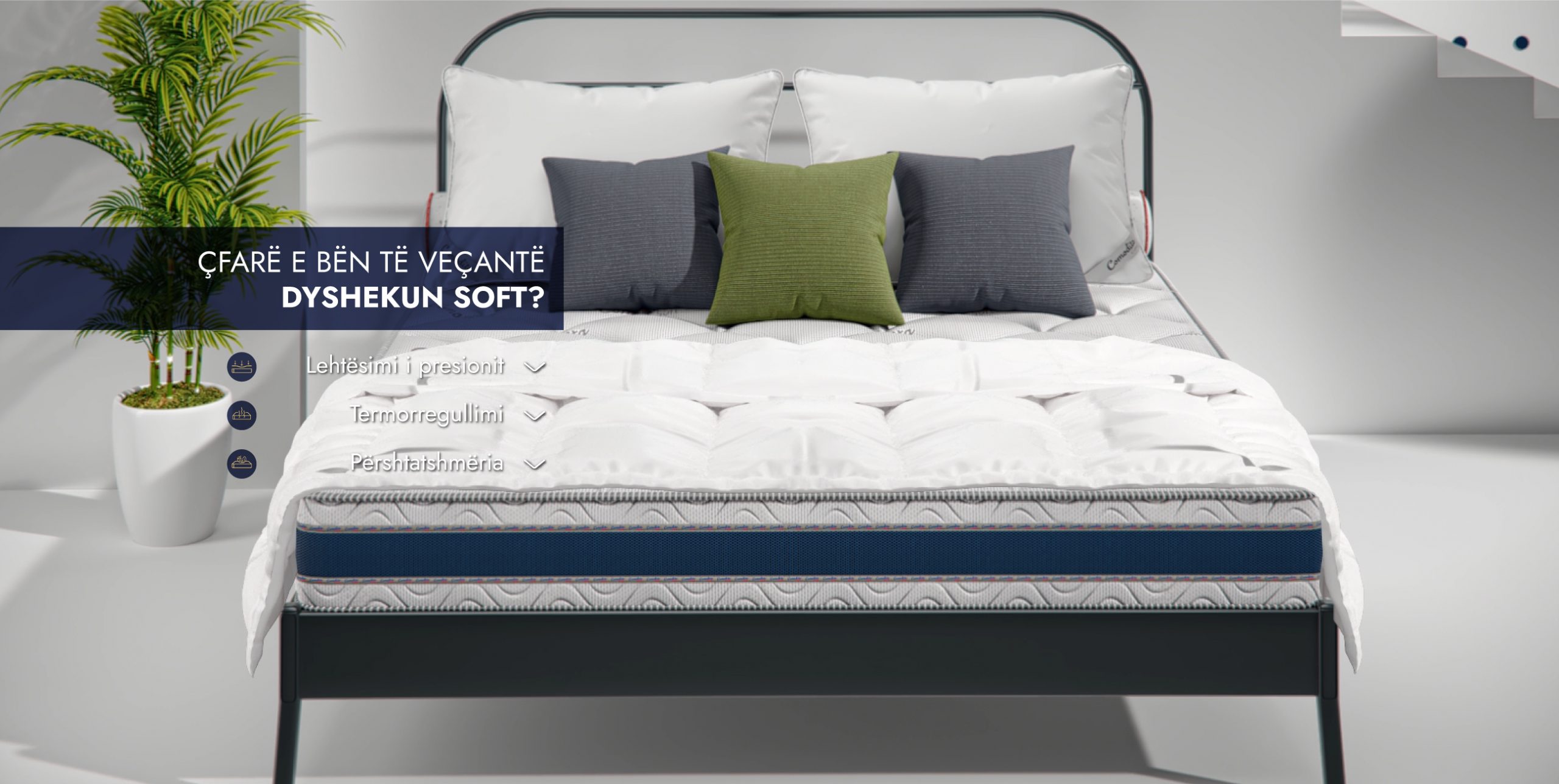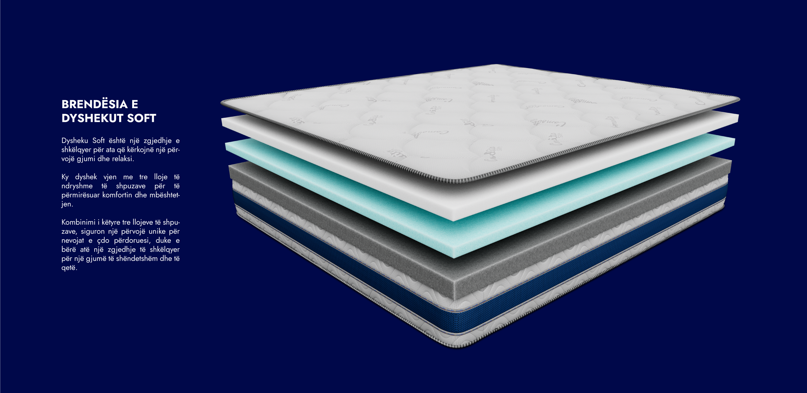 Dysheku i butë ka një lartësi prej 20 cm dhe karakterizohet si dyshek gjysmë i butë, gjysmë i fortë. Butësia e tij do t’ju ndihmojë të ndjeni kënaqësinë e një gjumi të rehatshëm. Dysheku ka një strukturë të ndërtuar nga tre shtresa shkume poliuretani me dendësi të ndryshme, e cila ndihmon në përshtatjen e menjëhershme të trupit tuaj me dyshekun, duke ju lejuar të flini në pozicionet tuaja të preferuara pa ndjerë presion.